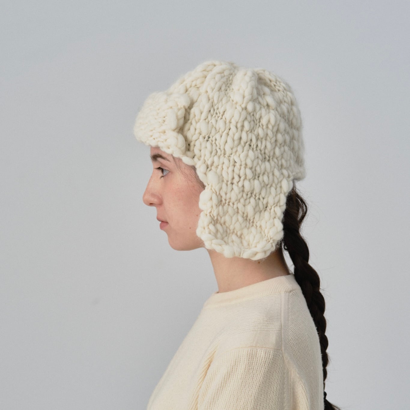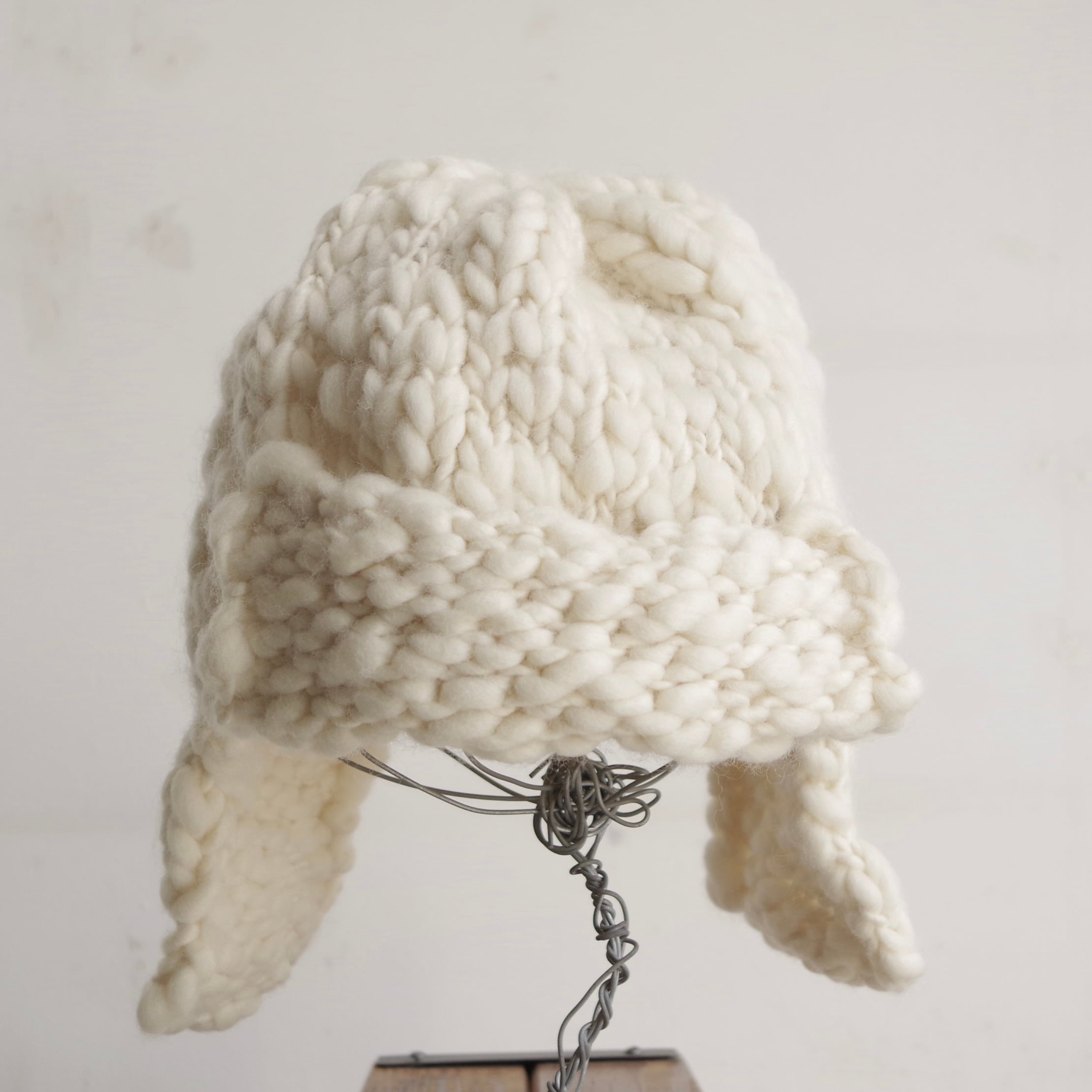 ソフトな手触りの極太スラブ糸を手編みで編み立てることにより、ふんわり柔らかな風合いと一点ずつ表情の異なる編地に仕上げました。