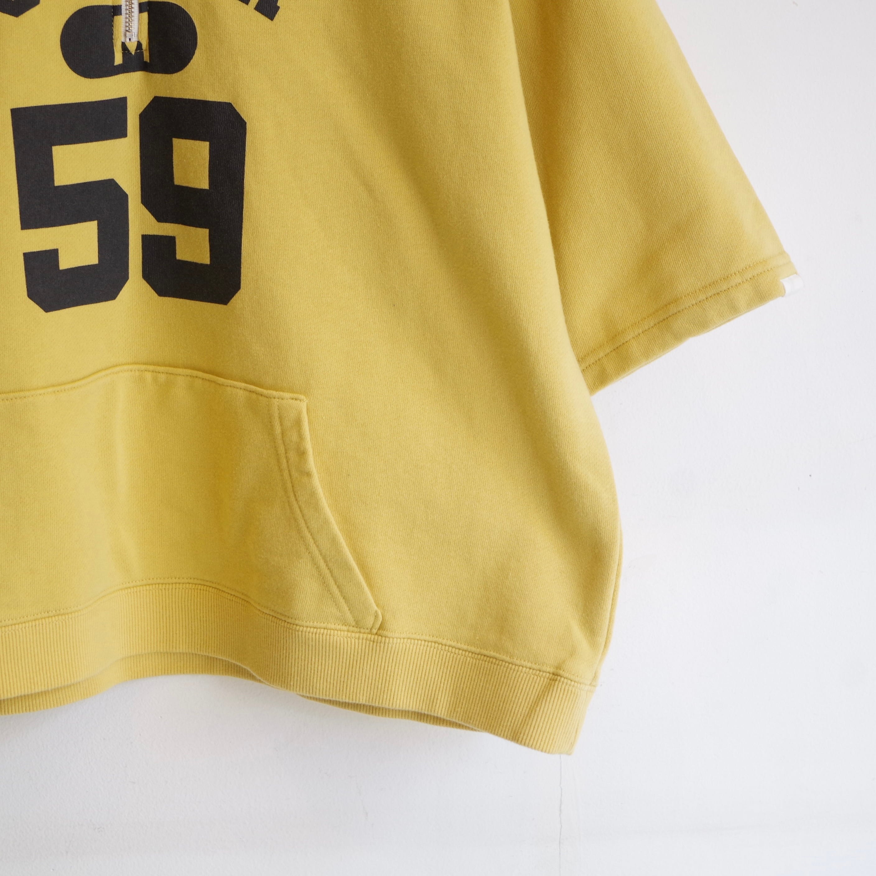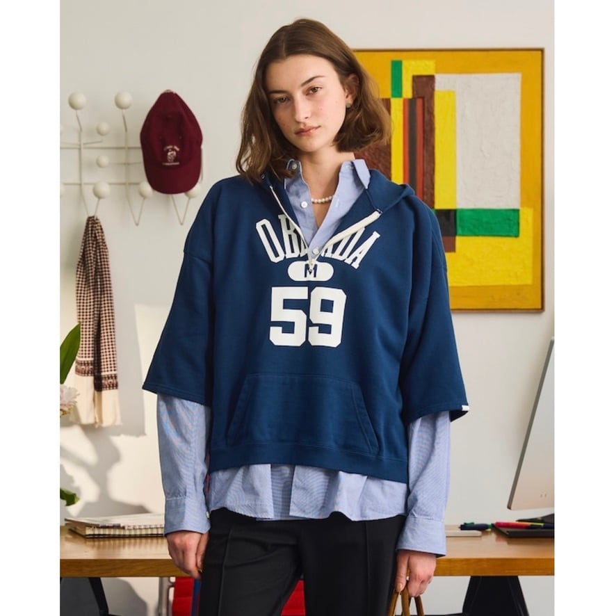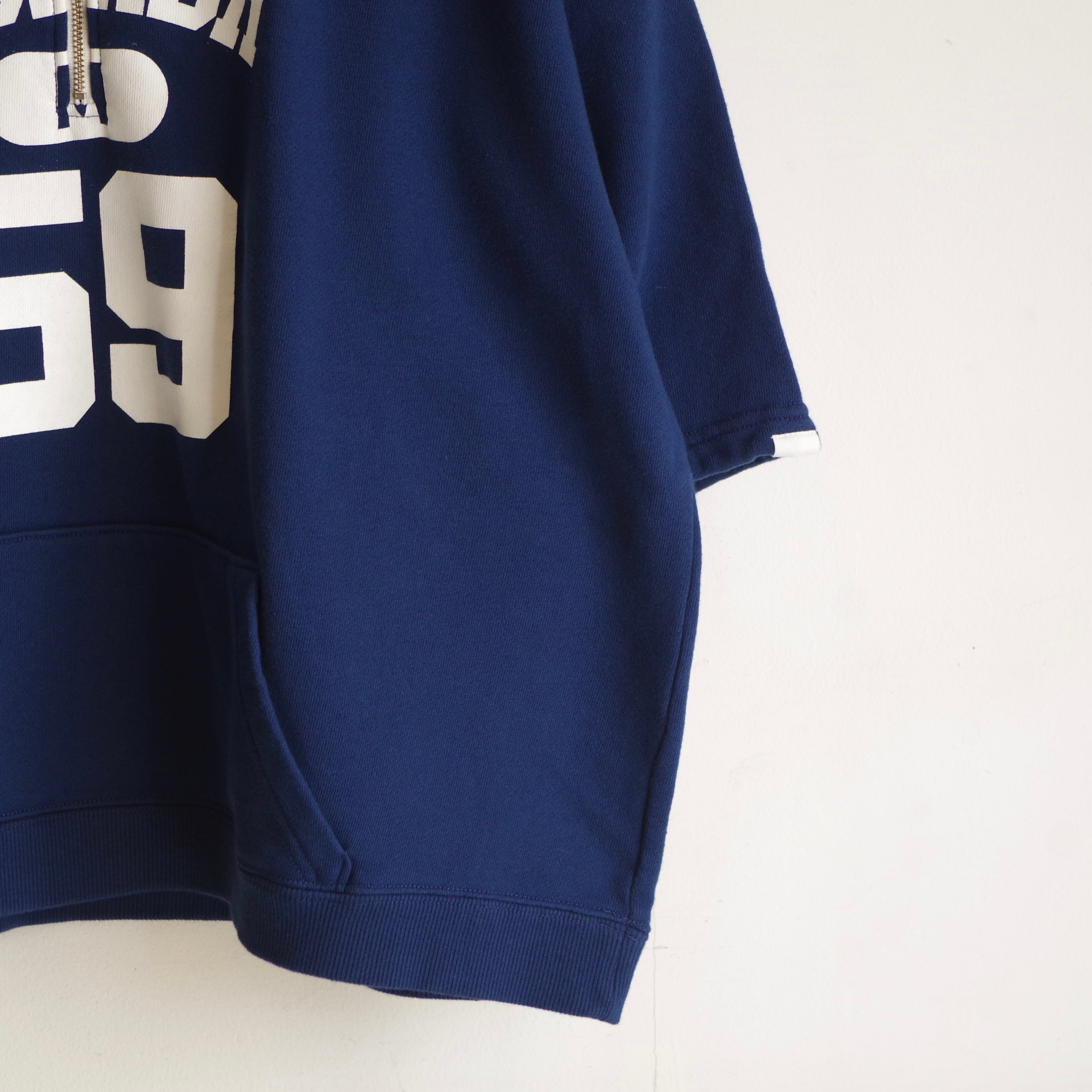 古着のスウェットをリメイクしたような雰囲気の、ハーフジップフーディー。