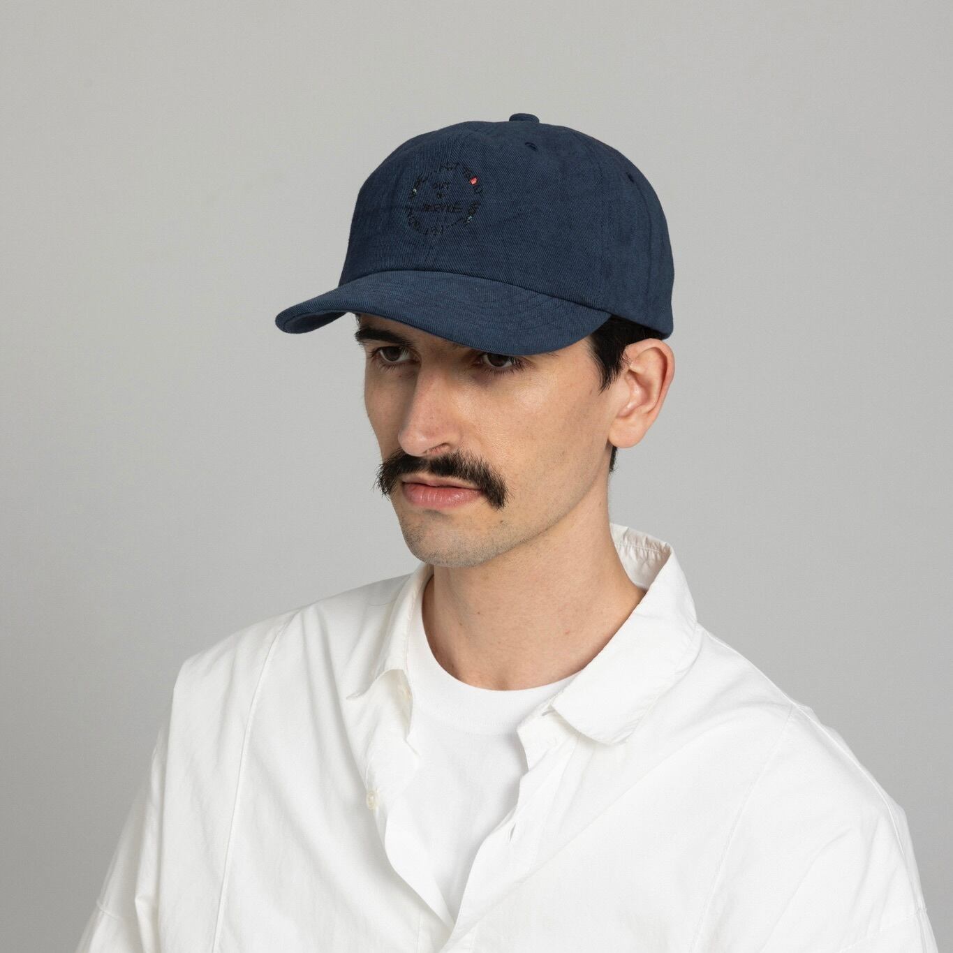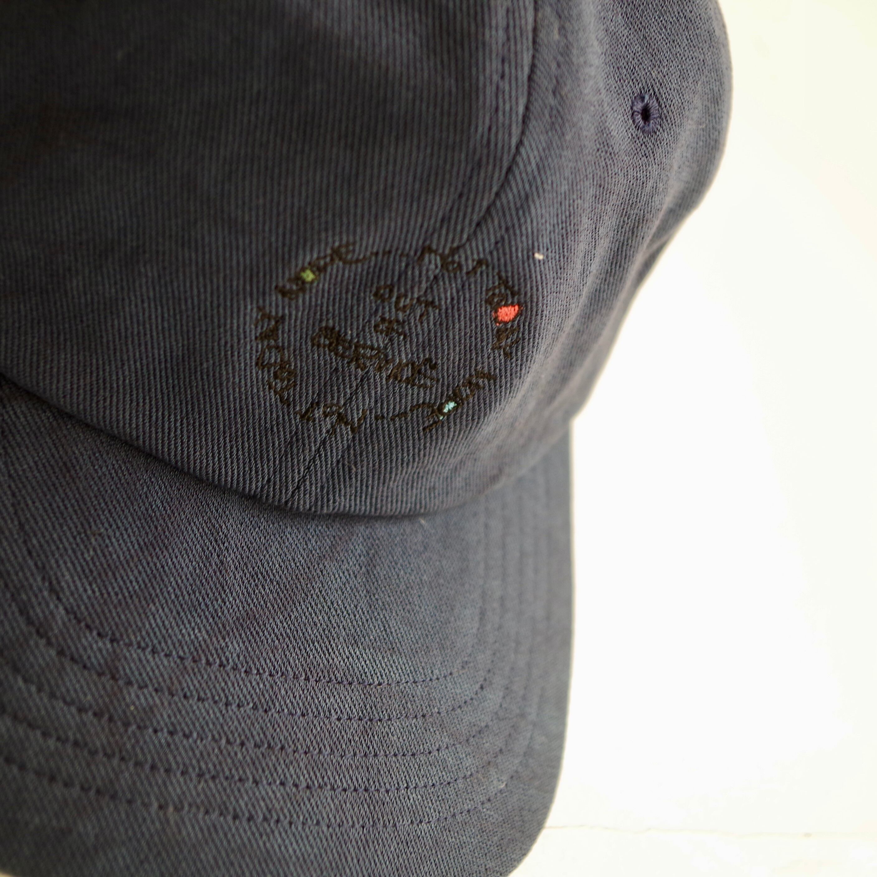力の抜けた手書き刺繍を施したベースボールキャップ。