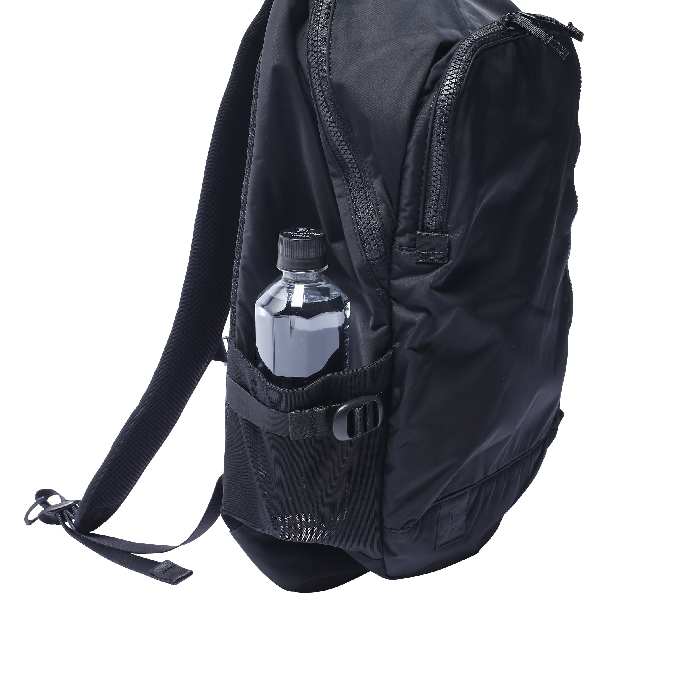 ・正面 ダブルジッパーポケット(メッシュスロットポケット x 2)、ブランド ネームタグ
