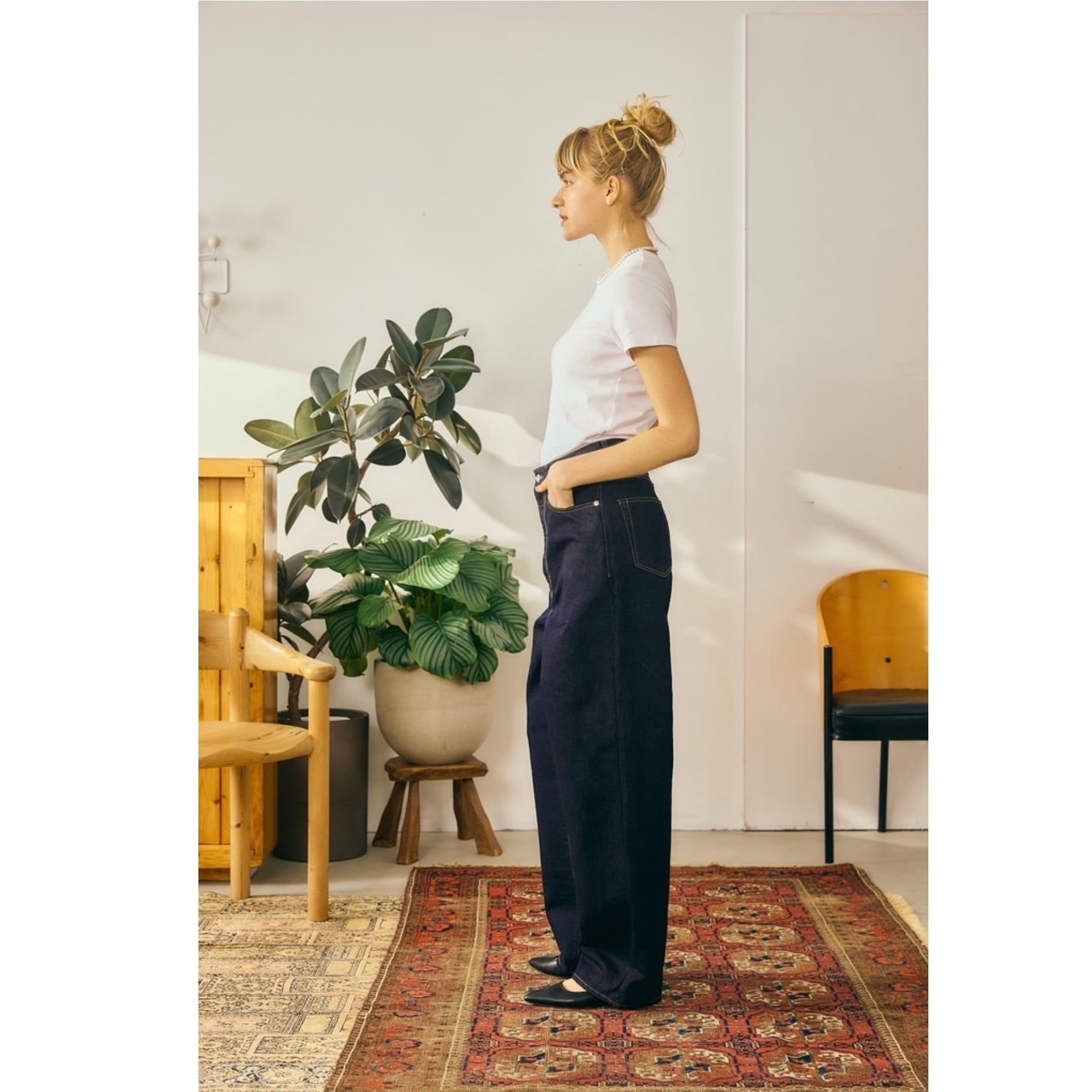 ほどよいハイウエストと、ゆとりのあるワタリにより快適な穿き心地を実現。ウエストの仕様にも工夫が施され、少し落として穿くことでより自然なシルエットを楽しめます。
