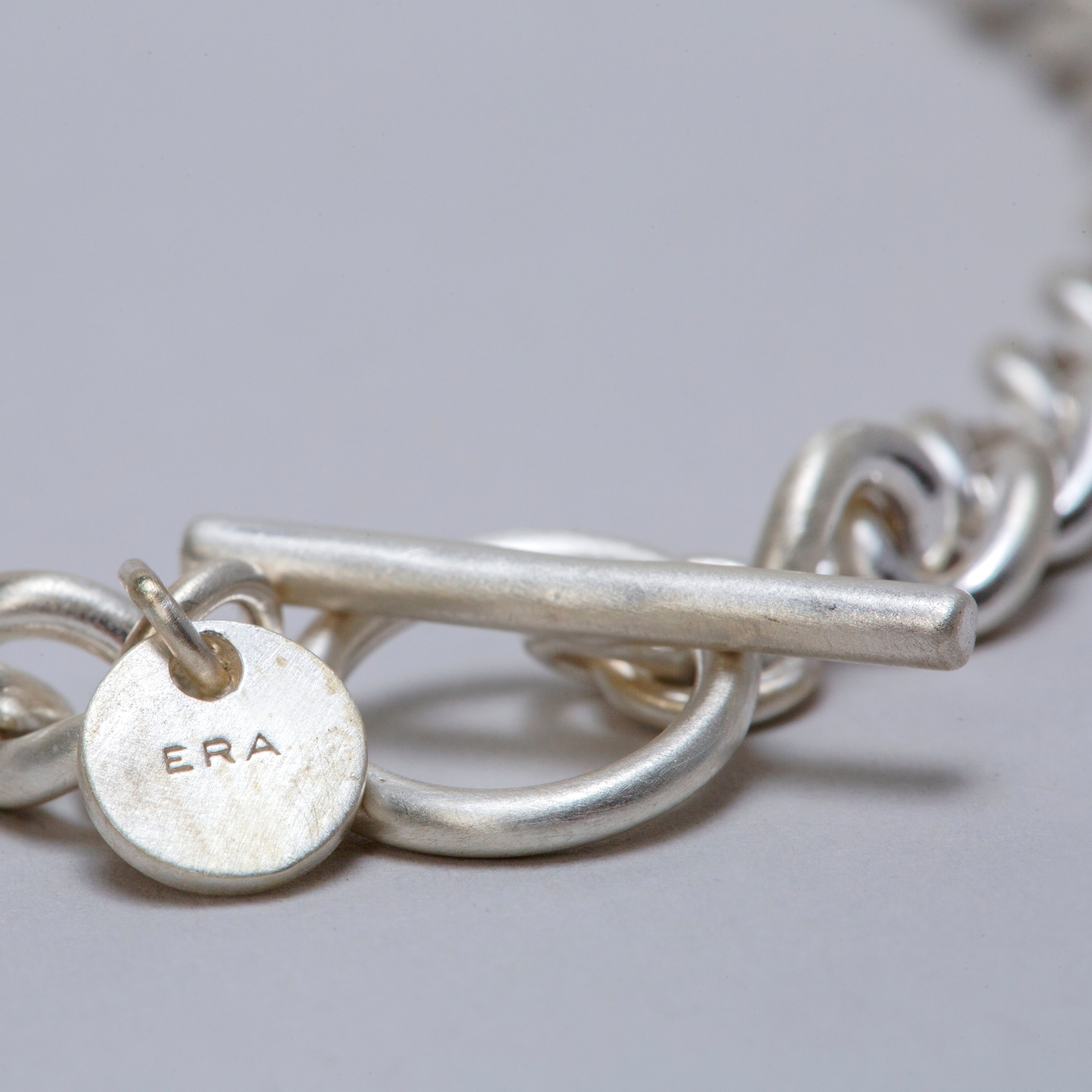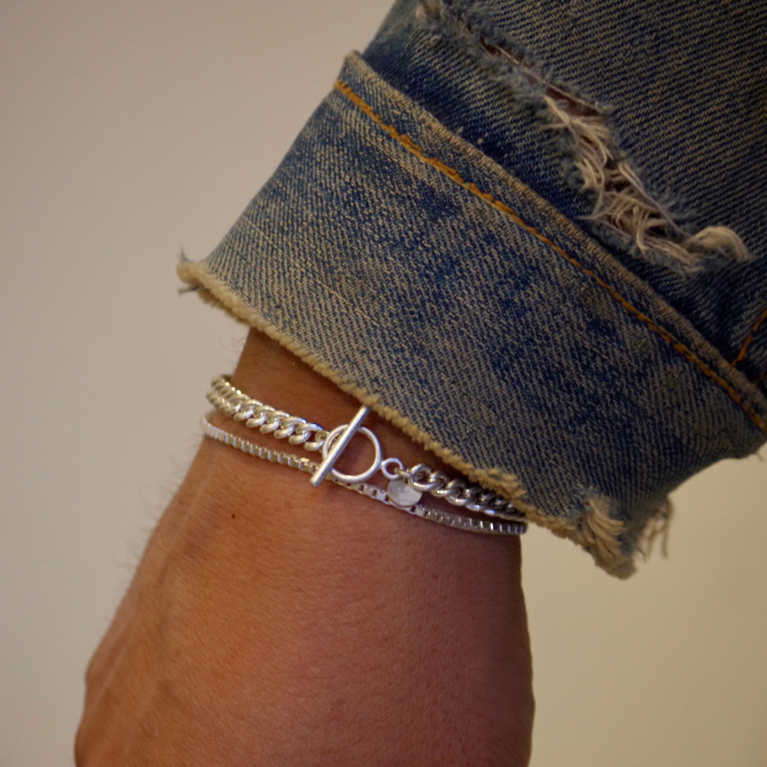 1.5mm幅の繊細なツイストチェーンで作ったブレスレット。Tバータイプの留め具もアクセントになります。スタイル、性別、TPO問わずつけていただけます。他のブレスレットや腕時計と合わせてつけられるミニマルさが魅力。