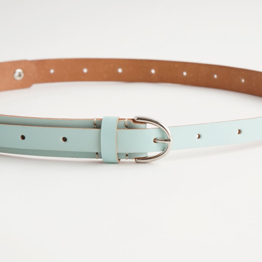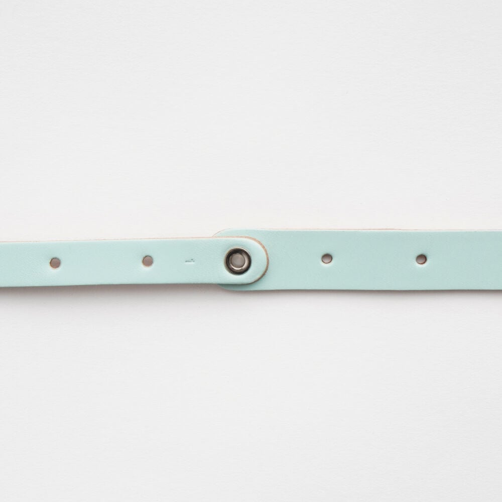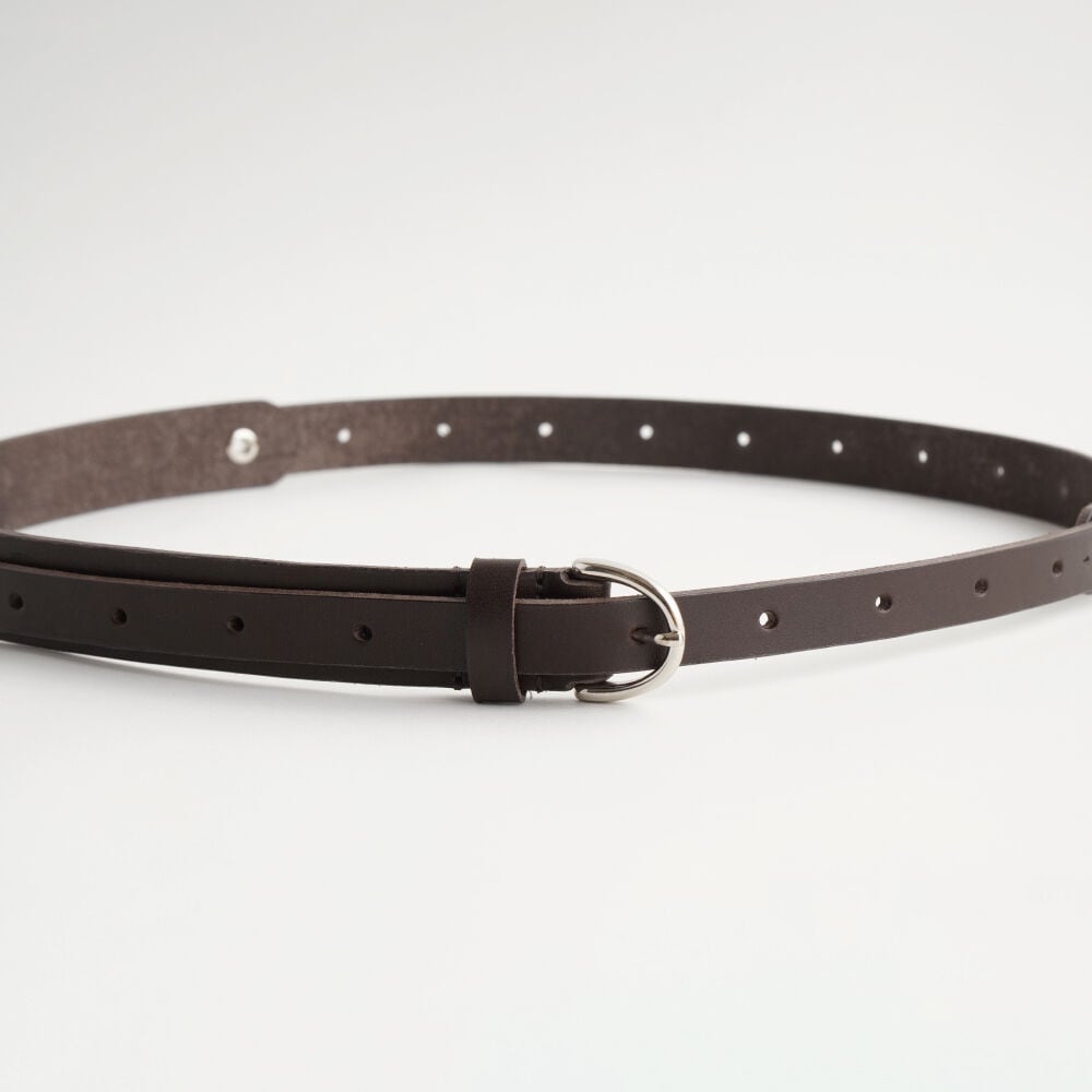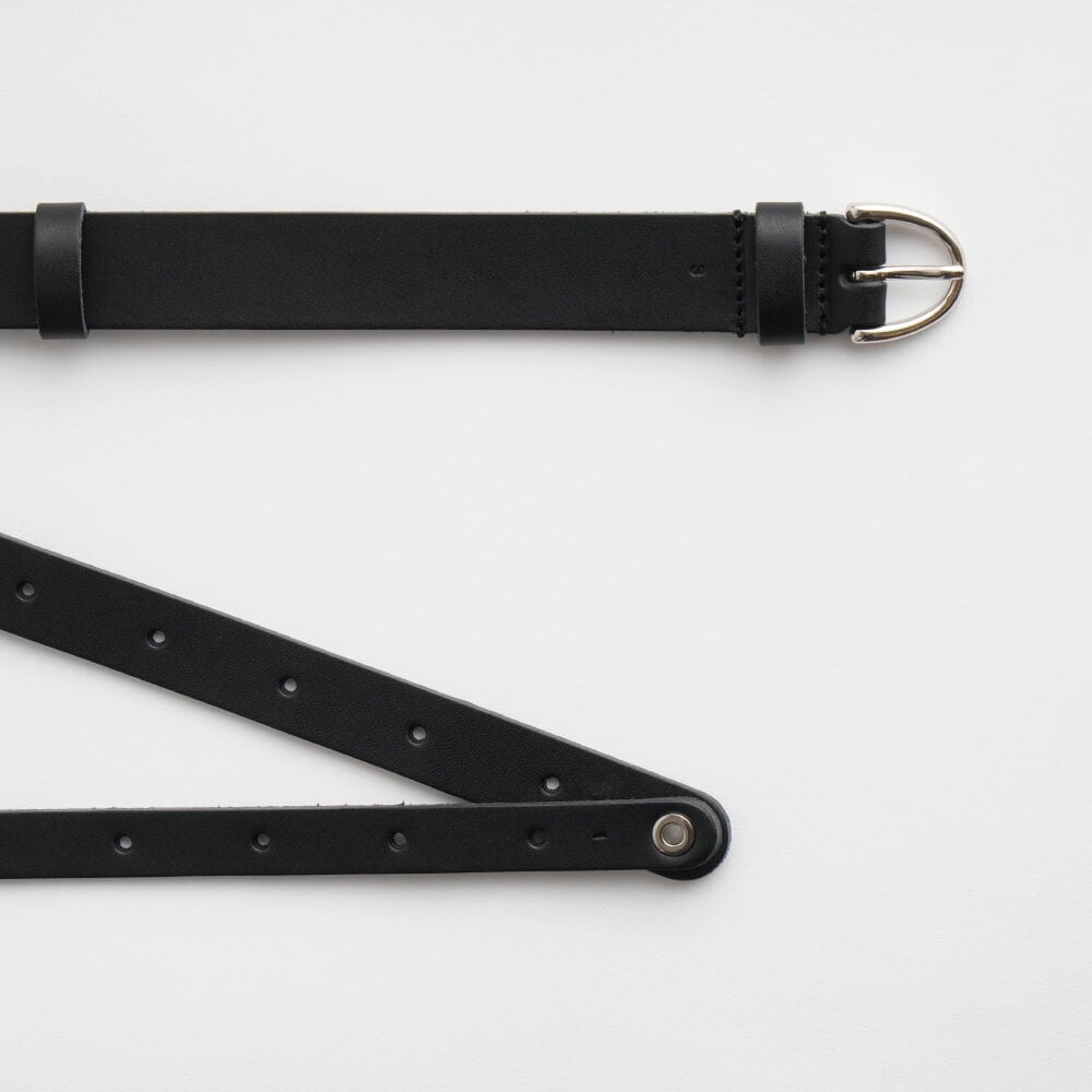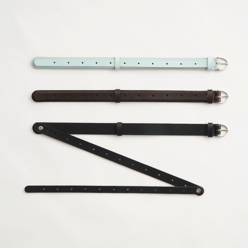 幅の異なる3枚のレザーを重ねた折りたたみ式レザーベルト。
