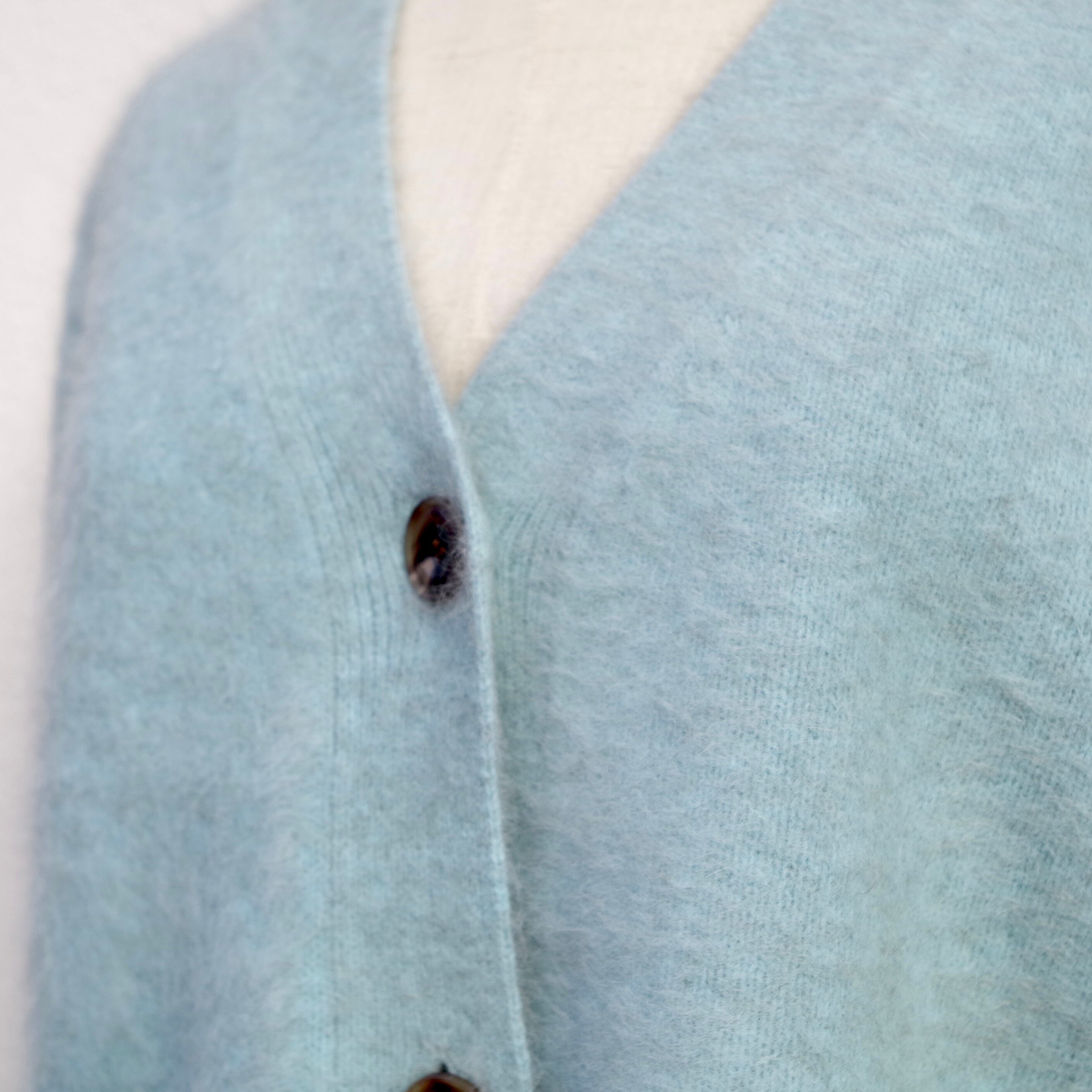 素材を引き立てるシンプルなデザインは、Vカーディガンをややワイドシルエットで、ストレスフリーな着心地をプラス。