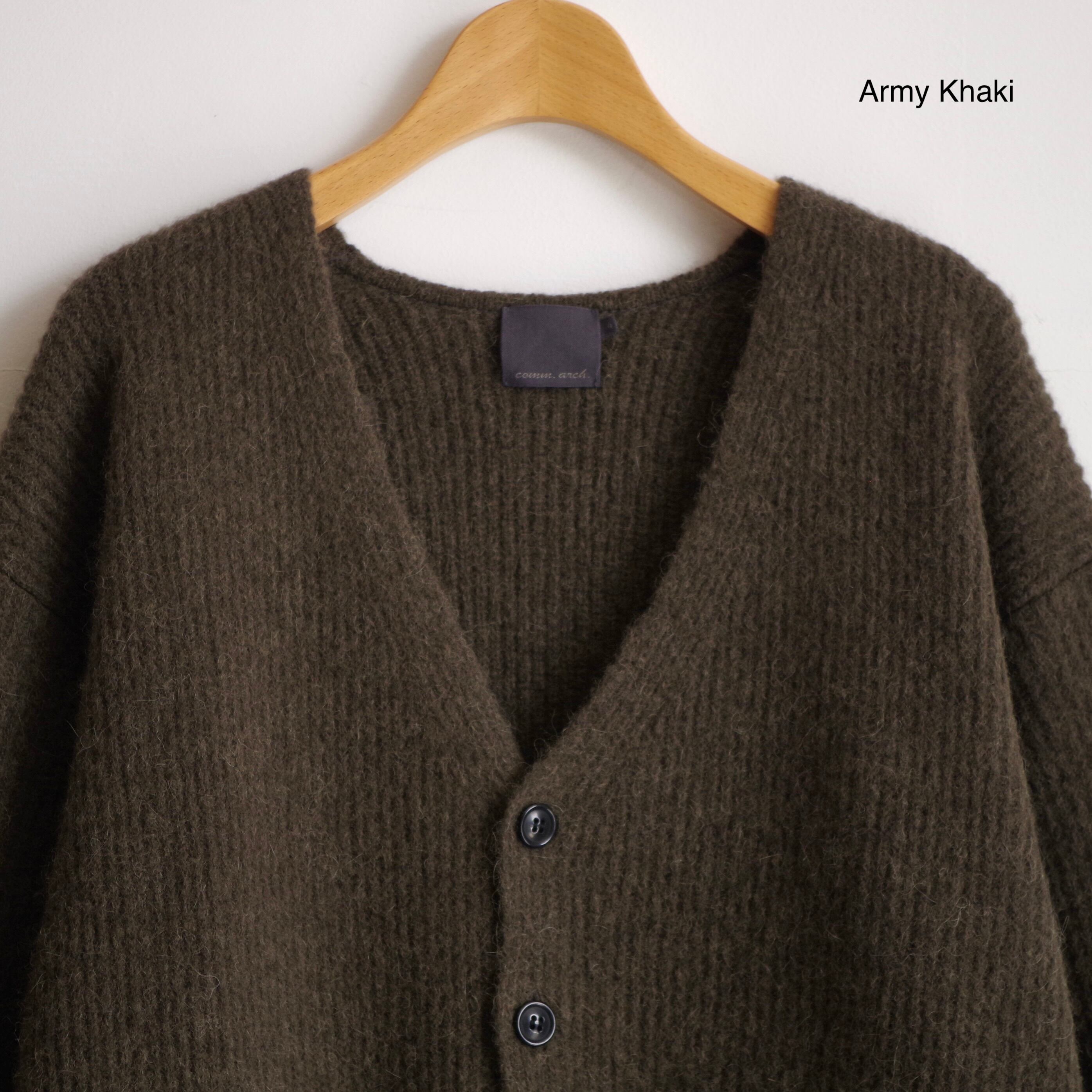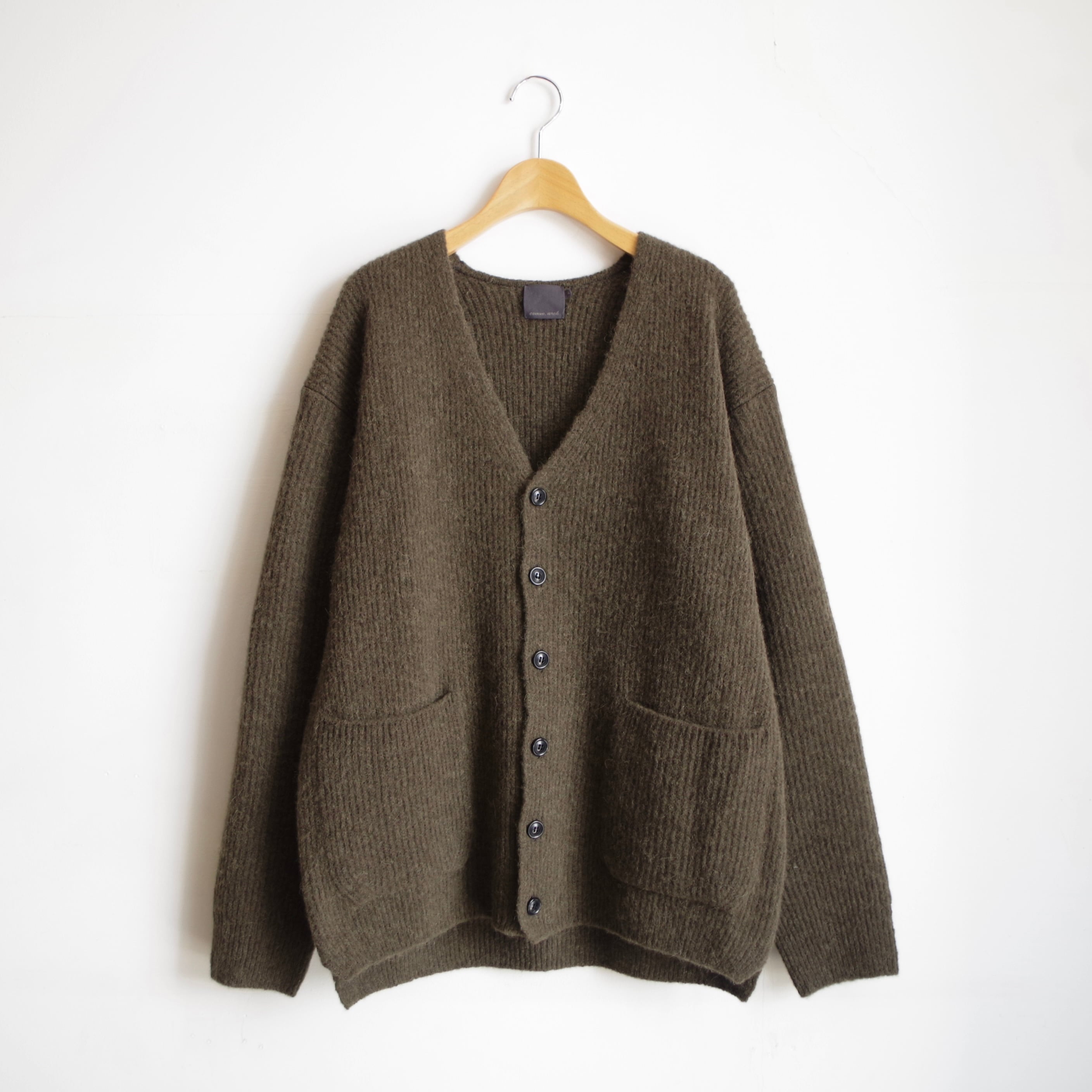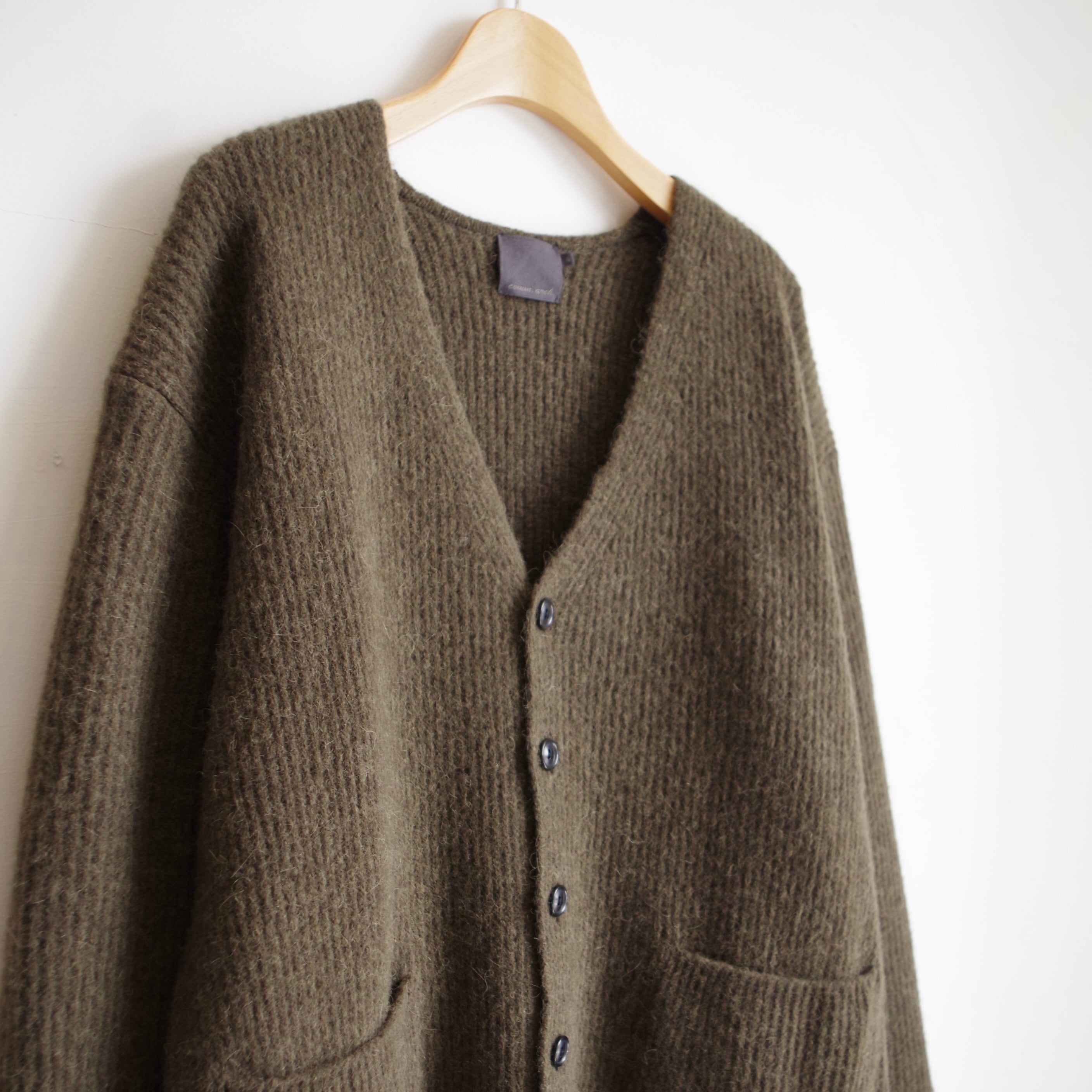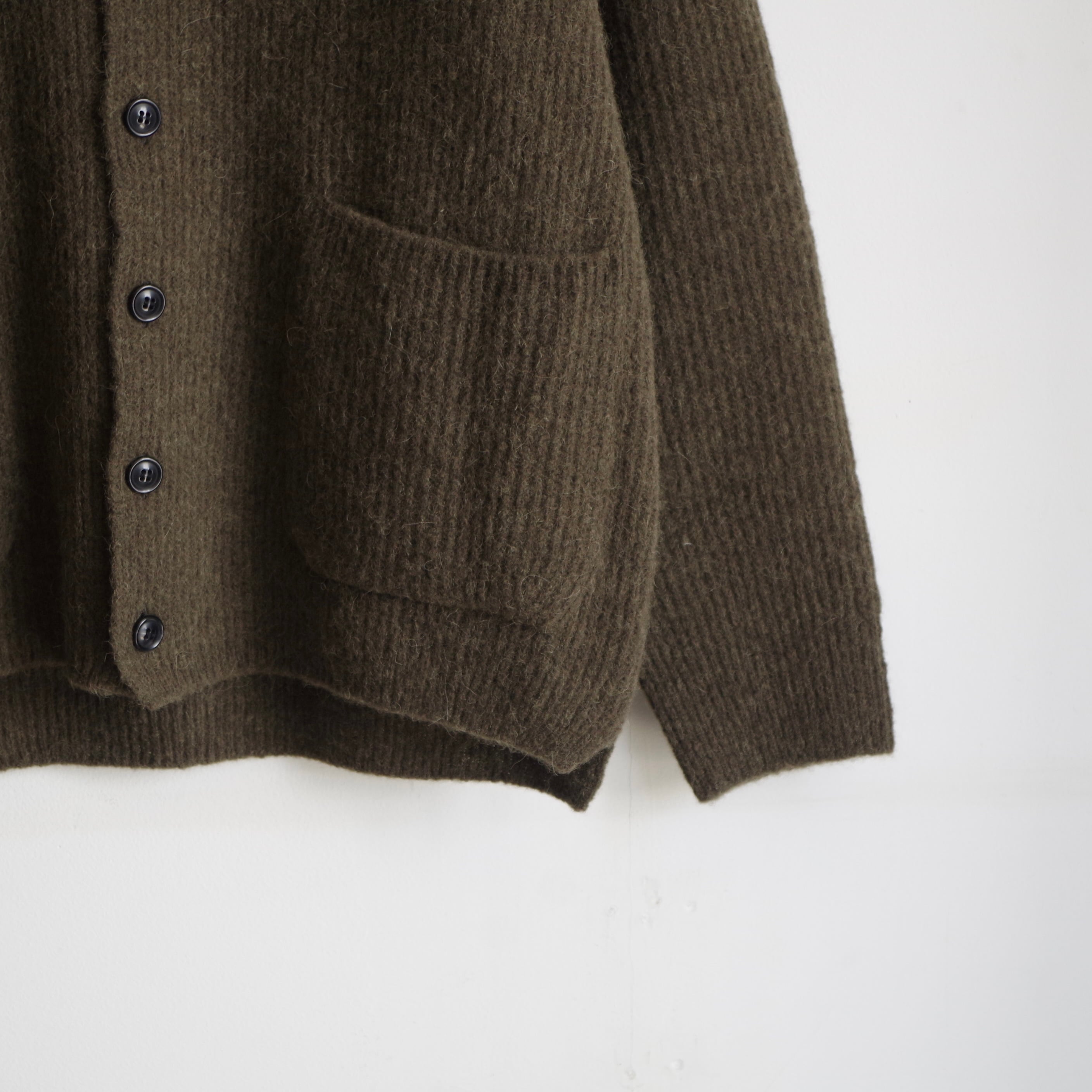 型はシンプルなVネックカーディガ ンですが、毛足と編地の厚さで見 た目インパクトのあるアイテム。