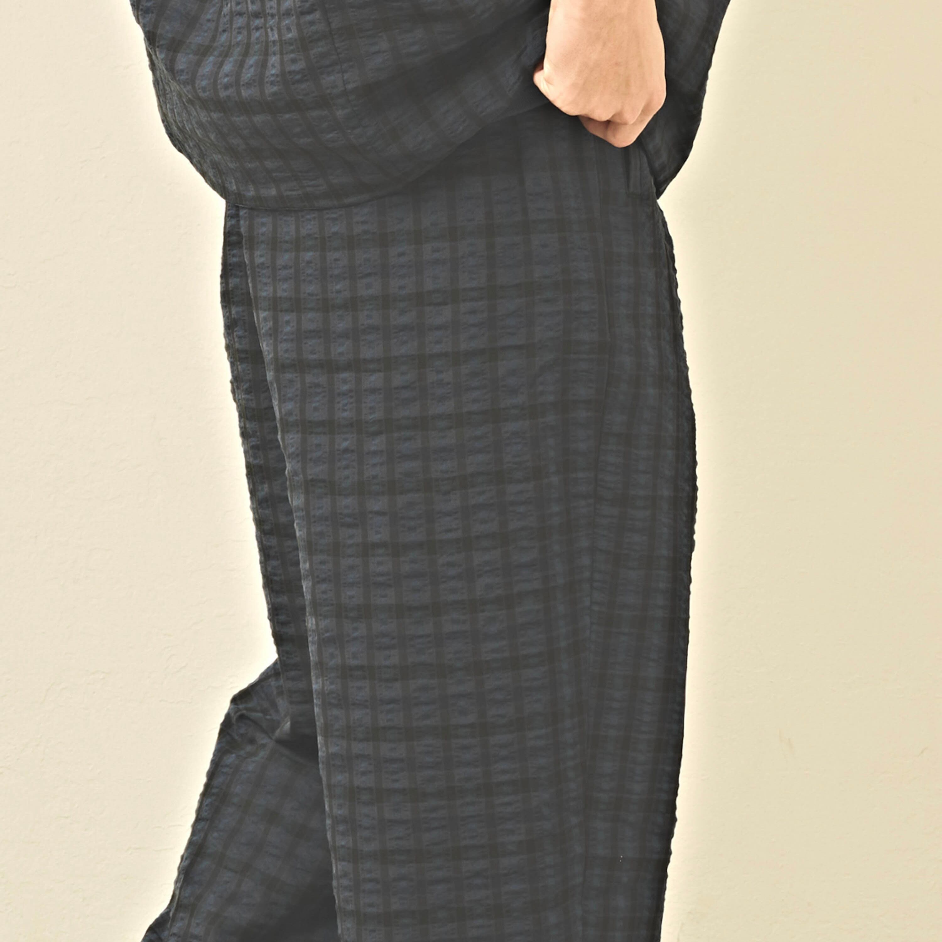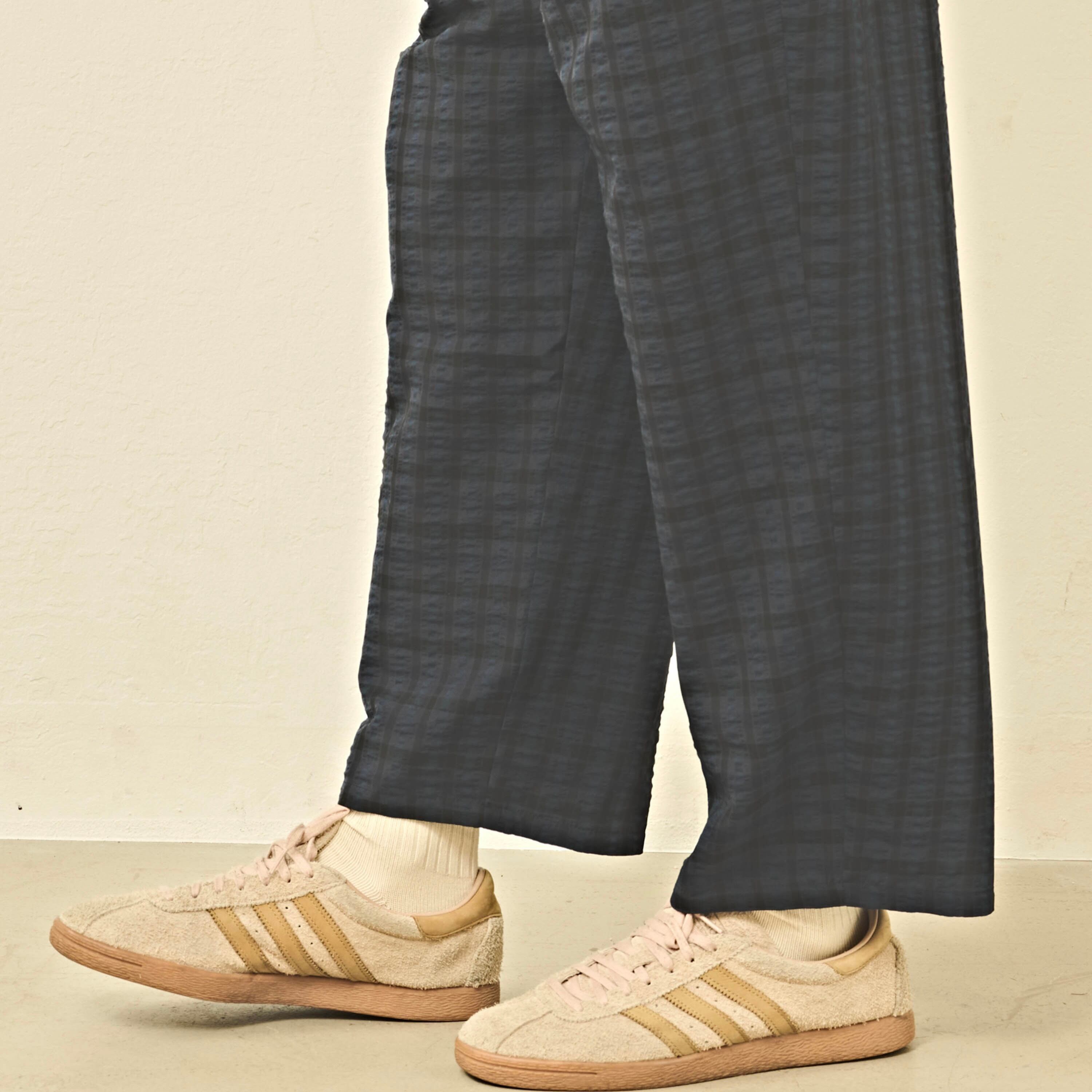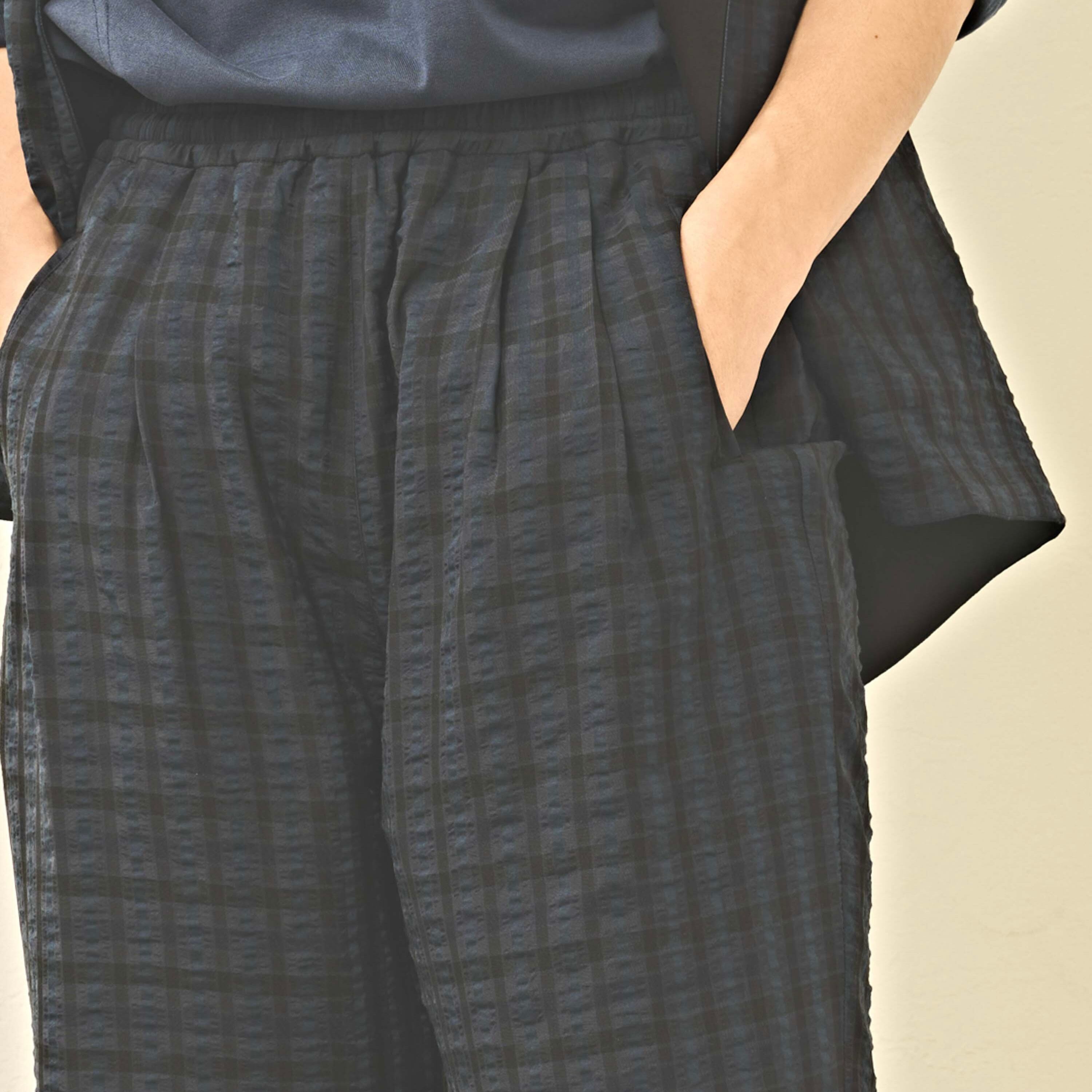 微光沢のあるチェックの素材感でスタイリングの外しにもおすすめです。