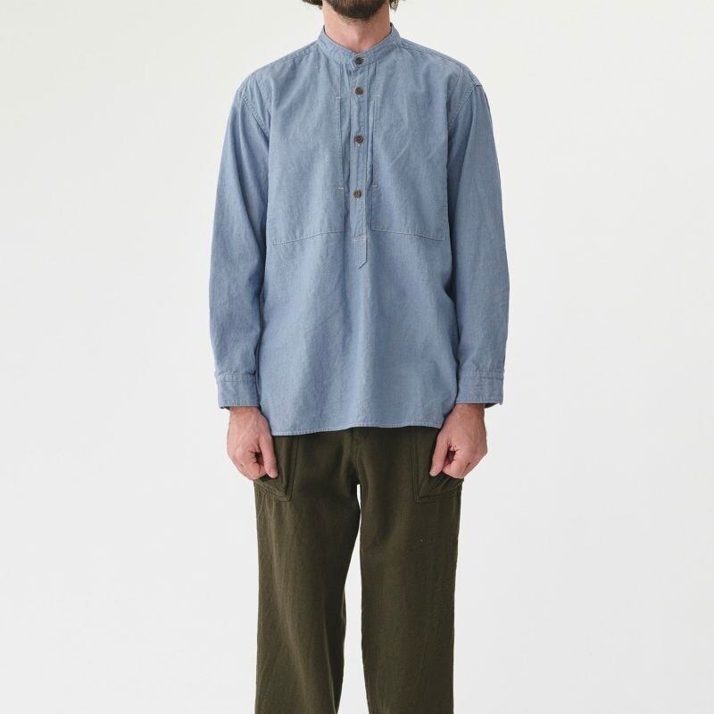 ボックスシルエットでワイドボディーのプルオーバースタンドカラーシャツ。